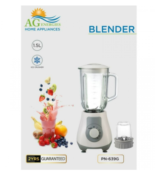 AG Energies Glass Blender 1.5L with Glass Dry Mill Grinder Specifications: Model: PN-639G Capacity: 1.5L Ice Crusher 2 Years Guarantee