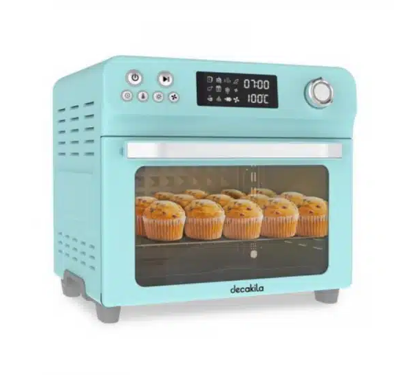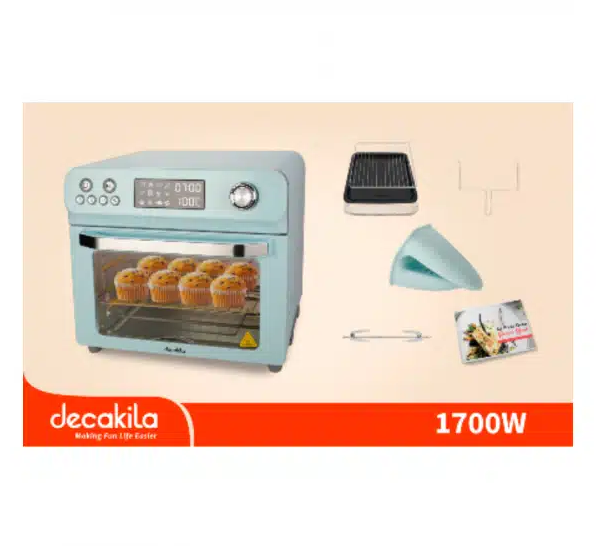 LED display Capacity: 24 l Power: 1800W Voltage: 220-240V 50/60Hz Temperature control: 0-230℃ Time control: 0-60 minutes Functions that include: French fries, fish, chicken, steak, bread, heat, dehydration, cake, pizza, grill stainless steel heating tube 6 pcs. shielded pole motor 1 pc. stainless steel handle 1 pc. 1 baking rack 1 baking tray 1 extraction rack 1 fried chicken fork silicone gloves 1pc. retractable slag tray
