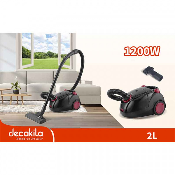 Brand: Decakila Model: CEVC002B Color: Black Vacuum cleaner with bag Padded handles Multi-use brush Soft bristle brush Parquet brush Flexible hose HEPA filter Bag capacity: 2 liters Power: 1200 W