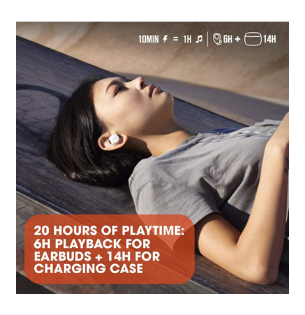 - UP TO 20 HOURS OF BATTERY: Never be without your music. JBL LIVE 300TWS Bluetooth headphones give you up to 6 hours of playback on a single charge. Pop them into the charging case for up to an additional 14 hours of listening. Get a one-hour boost in just 10 minutes